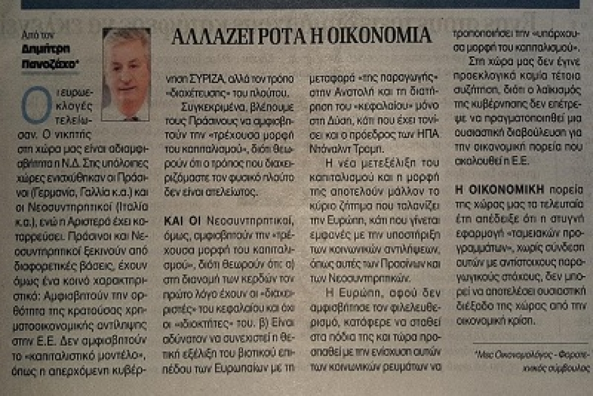 «Πράσινοι» και «Νεοσυντηρητικοί» ξεκινούν από διαφορετικές βάσεις, έχουν όμως ένα κοινό χαρακτηριστικό: Αμφισβητούν την ορθότητα της κρατούσας χρηματοοικονομικής αντίληψης στην Ε.Ε. Δεν αμφισβητούν το «καπιταλιστικό μοντέλο», όπως η απερχόμενη δική μας κυβέρνηση, αλλά τον τρόπο «διοχέτευσης» του πλούτου.